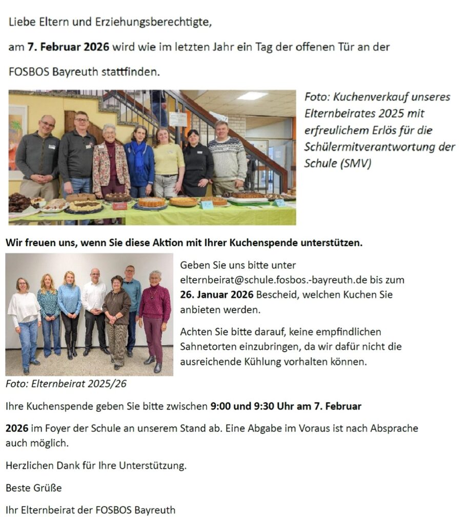 Unseren Elternbeirat erreichen Sie per Mail unter elternbeirat@schule.fosbos-bayreuth.de.